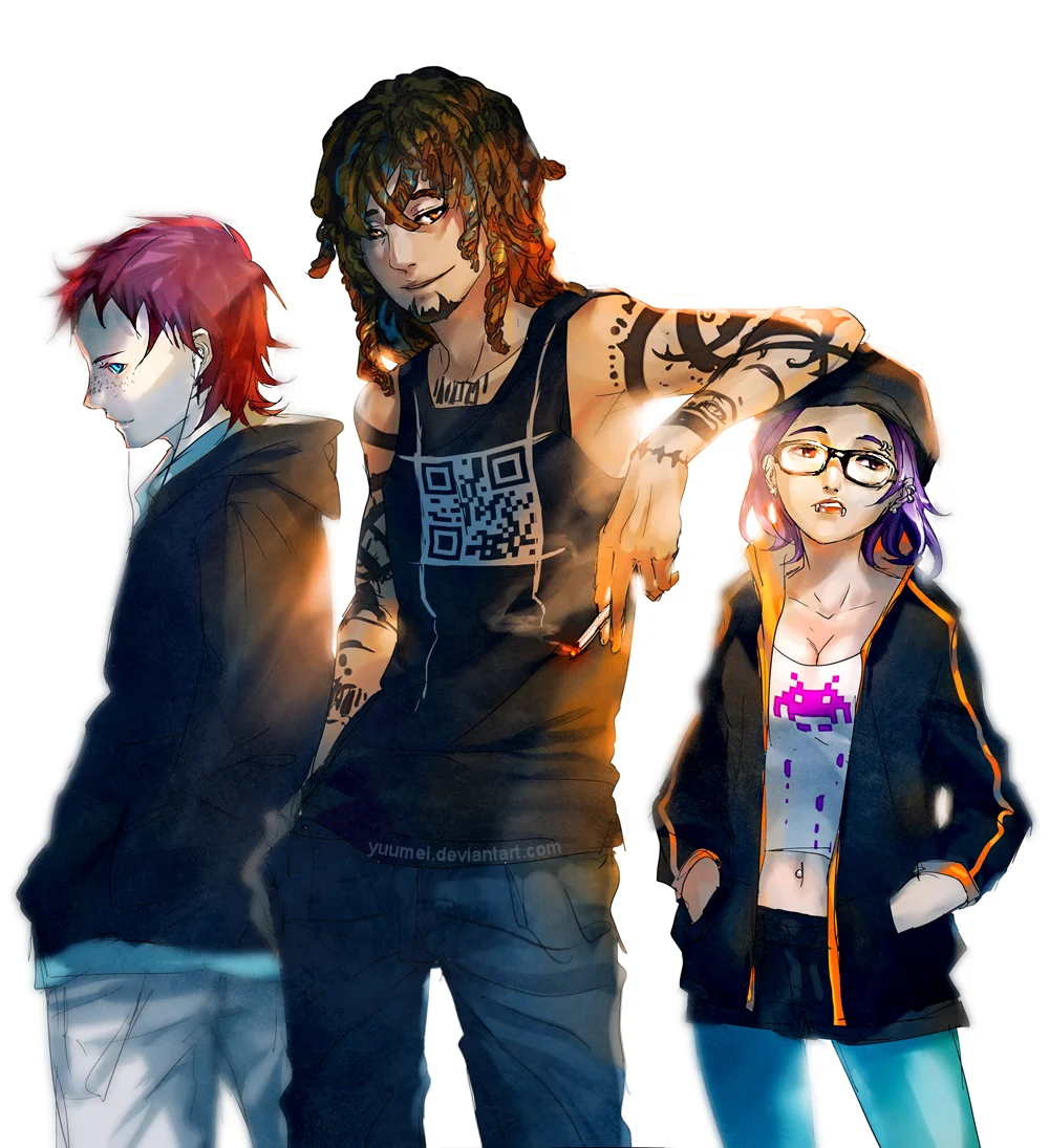 From the left, we have Michael , Jay, and Mel. Michael is quiet and polite irl, but is quite a foul mouthed troll online. Jay is the leader of the team. He is pretty laid back nowadays after being an uptight chemical engineering major in college. After spending a year studying abroad in Berkeley, he got into tattoos and smoking pot. Mel is a gamer girl who also enjoys trolling system admins. Otherwise, she is apathetic about everything else in the world.